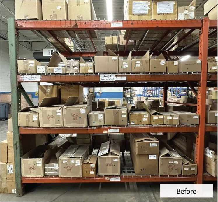 Before: Static pick locations from boxes. Poor space utilization, no FIFO flow, poor ergonomics, low Put-Away and low Picking efficiency.