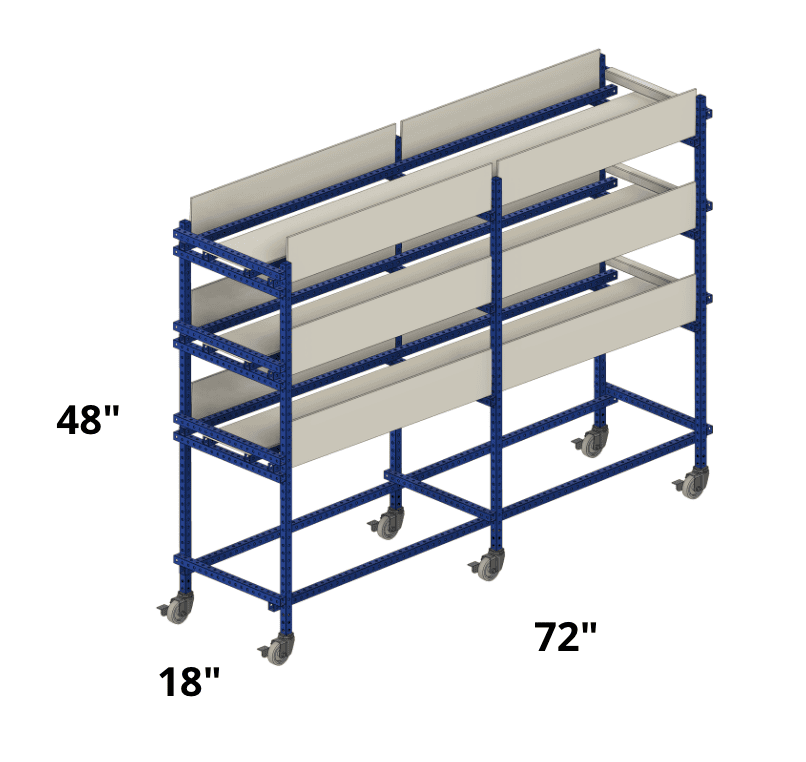 A 3-level flatbed flow rack designed with an angled surface to flow non typical material to the assembly line across its three levels.