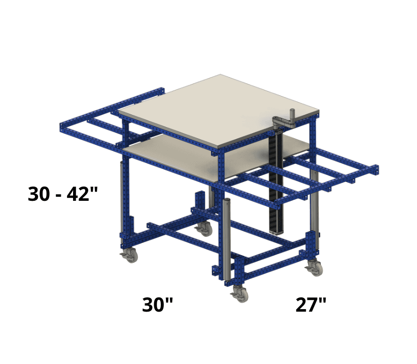 A height-adjustable work table designed to provide an ergonomic workspace. Table height is adjusted with a manual crank that has a collapsible handle. Side supports allow for bins or boxes to be placed for light assembly and packing operations.