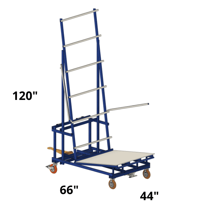 An angled cart designed to transport large metal framed assemblies. Used to securely hold and move large frames with an angled bed, facilitating easier navigation through facility spaces and reducing the risk of damage during transport. Tuggable with yellow hitch and easily maneuvered by operator. Material is strapped to frame of cart during transport (straps not shown). White UHMW sleeves provide protection for material and cart structure. Extended arms can be raised out of the way for loading frames. Back casters can be locked into place.