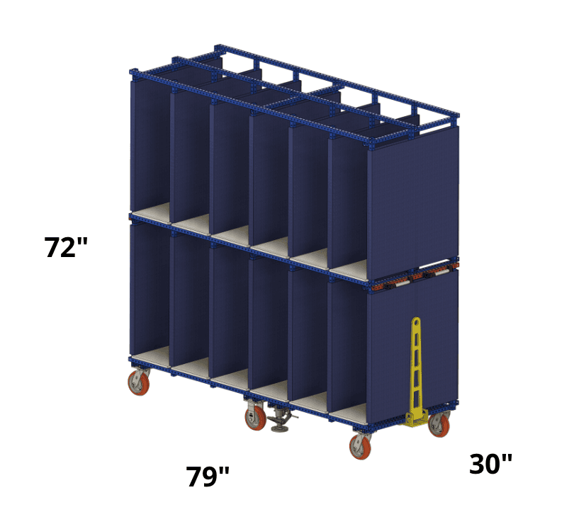 Cart has a zero turning radius and can be locked into position on the long sides of the cart by engaging the floor locks with the foot. Handles are positioned on both ends to manually push the cart. Part load and unload positions are ergonomically located to reduce operator strain.