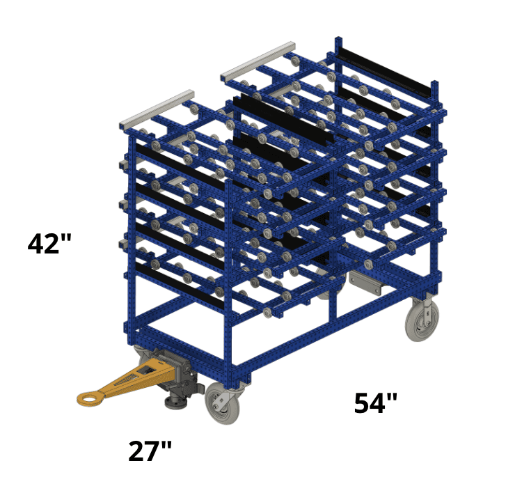 A battery cell tray flow rack designed to flow and stage battery cells in trays, utilizing a gravity-fed system to transition cells from battery tray production to encapsulation process. Heavy carts are easily moved by operators manually and tugged by tuggers.