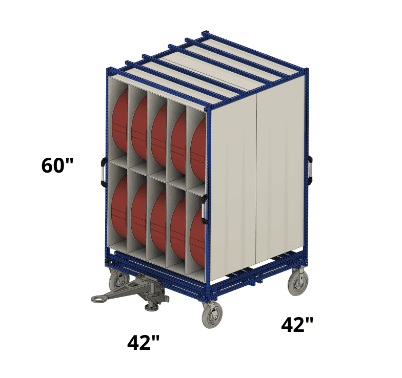 A harness bag cart designed to transport and store harnesses in protective bags, providing organization and easy access while protecting the harnesses from damage and contamination during handling and assembly processes. Bags can be custom sized.