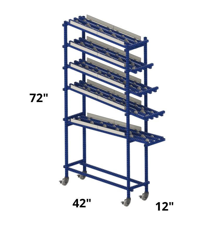 A 5-level flow rack designed to flow tote bins in each lane to an elevated platform. The rack uses gravity-fed skate wheels to move smoothly from the loading end to the picking end. Return lane used for empty tote bins.
