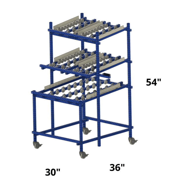An indexed, 3-tier gravity flow rack designed to organize and automate the flow of materials across three levels.