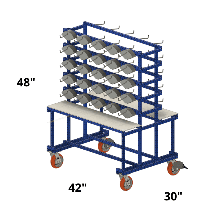 A mobile hook storage designed to organize and transport items that can be hung, such as tools or components. Cart can be positioned close to the point of use. In this example we show machining jaws, which are located right next to a machining center where they are used. Tabletops on both sides provide temporary placement of items as they are retrieved or put away.