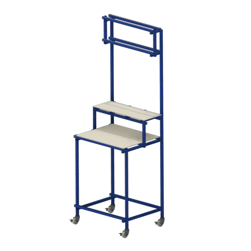 A mobile workstation with overhead hanging tool support. Shelf provides space to organize parts in bins or bags. Workstation can be easily moved relocation to different work areas as needed, and wheels can be locked in place.
