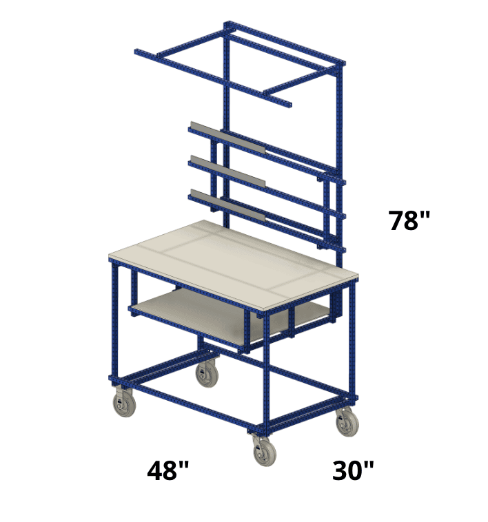 A mobile worktable with overhead support for tool hangers and work light. Left rear vertical side of worktable has bin hangers for small parts to provide point-of-use storage. Right vertical rear side has space for computer monitor. Scanner, keyboard and mouse can be stored on tabletop or on shelf. Tools can be hung on right vertical side area in back or placed on shelf below.