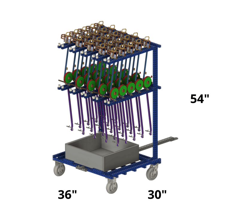 A paint jig cart designed to securely hold and transport items in a fixed position for painting, stabilizing the items during the process.