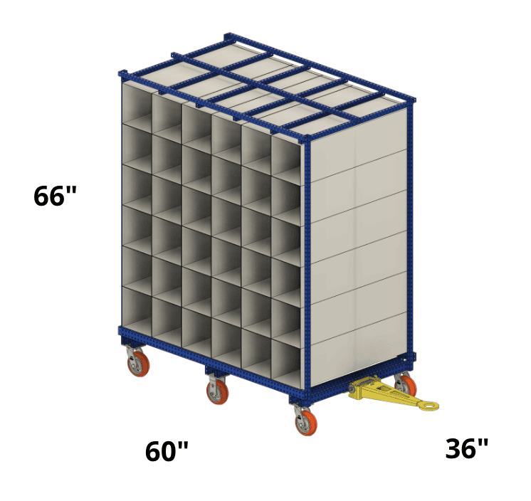 A towable bag cart with 36 compartments. Designed to efficiently transport and organize products or materials. Cart has a zero turning radius fort easy maneuverability. Bag material provides Class A surface part protection.