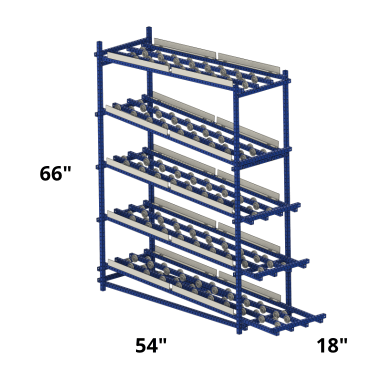 An indexed 4-level flow rack with a return level designed to efficiently deliver materials to the point-of-use across four tiers. Uses an indexing ("waterfall") system to provide various picking points, combined with a return lane for empty containers. Note: Lowest level is used for parts that are only occasionally used.