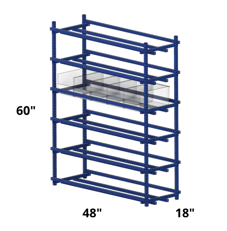 A 6-level static shelf rack used to store a variety of materials and components across multiple tiers, maximizing vertical space and keeping inventory organized and accessible.