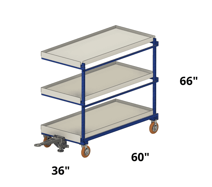 A towable flatbed shelf cart with containment edges designed for versatile transportation and storage of large, flat, or irregularly shaped items. Shelves are cantilevered to allow unencumbered access for loading and unloading. Promotes efficient movement of items across different areas of the facility.