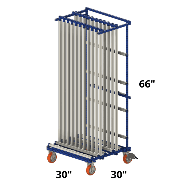 A panel cart designed to transport large, flat panels such as sheets of metal, wood, or glass, using upright supports to secure the materials in place during movement around the facility. White UHMW sleeves provide Class A surface part protection.