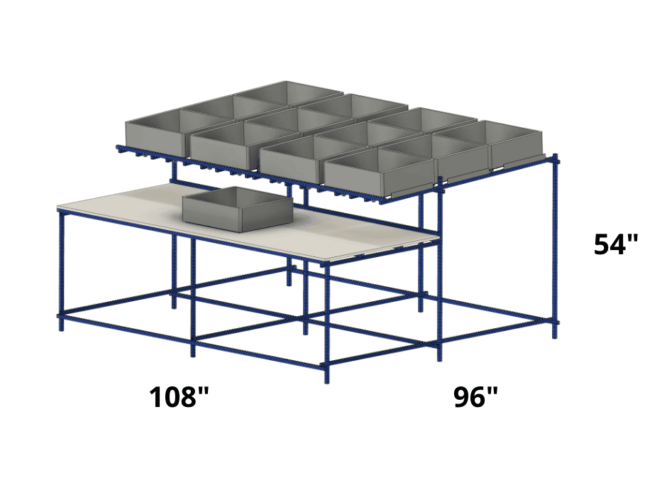 Designed to provide an ergonomic workspace to assemble product. Provides easy access to tools and materials via gravity flow of bins. Holds (12) 22"x24"x7" plastic tote bins. Increases productivity and 5S organization.